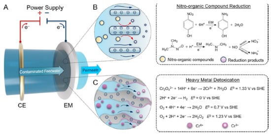 Shows the electrochemical reduction of toxic contaminants using an electrified membrane (EM). (A) Schematic diagram of a typical electrified flow-through filtration system consisting of a DC power supply, a downstream cathodic EM serving as the working electrode, and an anodic metal ring serving as the counter electrode (CE). From the CE to the EM, the contaminated feed water flows through the system. It should be noted that the system also makes use of an upstream EM. EM reaction mechanisms (dashed line boxes) and schematics (dotted circles) (B) Nitro-organic compound (e.g., 4-nitrophenol and NDMA) and (C) heavy metal (e.g., Cr6+) mediated reduction [].