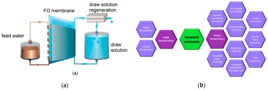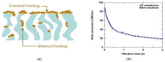 The development cost of membrane filtration and desalination technology is low, and it can separate suspended or dissolved components in wastewater. Membrane is a physical barrier that can pass through them based on the physicochemical properties of certain compounds. The membrane consists of a porous support layer and a thin and dense top layer []. Pore size-based membrane filtration-ultrafiltration (UF) removes extremely tiny particles and dissolved molecules from fluids based on molecular size; however, the permeability of the filter medium is modified by its chemical, molecular, or electrostatic characteristics in all filtration applications. For a sample of water, UF can only separate molecules whose size differs by at least one order of magnitude. UF cannot separate molecules of similar sizes. Materials with molecular weights ranging from 1 kDa to 1000 kDa, as well as colloids and particles retained by certain UF membranes, are passed through by salt and H2O. The UF membrane cleans the material that passes through the filter and collects the material that the filter retains. Substances that are substantially smaller than the pore size pass through the filter, but substances that are much bigger than the pore size are held by the filter and can be concentrated or separated from low molecular weight pollutants. UF is used for separating proteins from buffer components for buffer exchange, desalting or concentration, removing or exchanging sugars, non-aqueous solvents, separating free from protein-binding ligands, removing low molecular weight materials, or rapidly changing environmental ions and the pH value depends on the protein to be retained, and the most commonly used membranes have a nominal molecular weight limit (NMWL) of 3–100 kDa. UF is more effective than precipitation because it can concentrate and dilute solutes at the same time, without phase change, which denatures unstable substances, and can be carried out at room temperature or lower [].