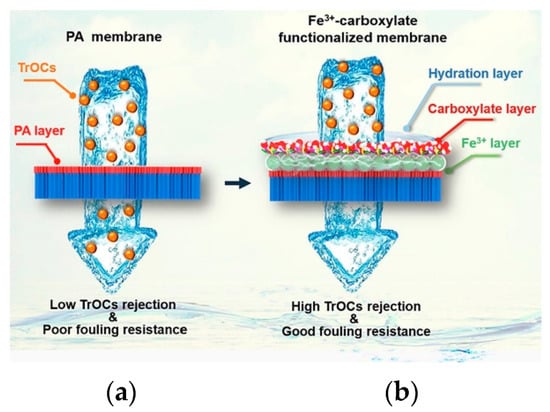 - Dong, X.; Meng, Q.-W.; Hu, W.; Chen, R.; Ge, Q. Forward osmosis membrane developed from the chelation of Fe3+ and carboxylate for trace organic contaminants removal. Chem. Eng. J. 2022, 428, 131091. [Google Scholar] [CrossRef]