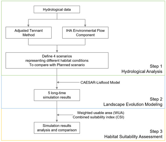 We conducted a three-step sequence of hydrological analysis, landscape evolution modeling, and habitat suitability assessment (Figure 1) to explore the ecological ramifications of different flow scenarios for the lower Yongding River. First, we used the Indicators of Hydrologic Alteration (IHA) version 7.1 [37] and the adjusted Tennant method [38] to understand the historical flow regime and calculate various environmental flow discharges. Second, we applied the CAESAR-LISFLOOD-FP model version 1.9j to simulate long-term (i.e., ten years) landscape evolution under four environmental flow scenarios identified from step 1 and compared them with the flow replenishment plan proposed by the Beijing Water Science and Technology Institute (BWSTI). Finally, we used the Combined Suitability Index (CSI) and Weighted Usable Area (WUA) [39] method to assess the amount and distribution of suitable fish habitat and compare the ecological effects of all five flow scenarios.