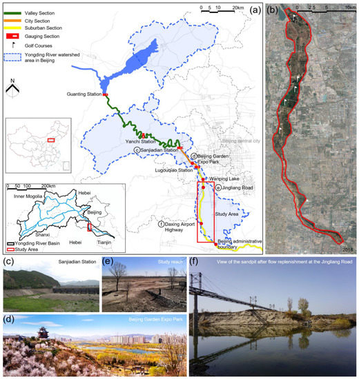 Context of the lower Yongding River, Beijing, China: (a) study area location in Beijing, YDRB, and the country; (b) study area 2018 aerial photo; (c) the Sanjiadian Station; (d) Beijing Garden Expo Park; (e) dry channel near the Daxing Airport Highway (before flow release); (f) in-channel sandpit at Jingliang Road (after flow release). (Photo sources: c-http://blog.sina.com.cn/s/blog_447e88bb0100k7nr.html (accessed on 30 October 2021); d-http://www.gardenexpo-park.com/ (accessed on 30 October 2021); (e,f) by Author 1).