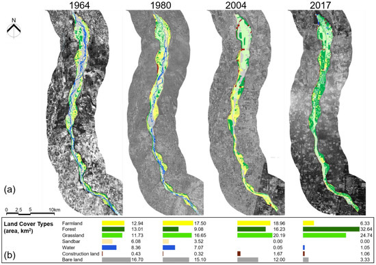 Evolution of the study area from 1964 to 2017 as seen from the aerial photos (a) and measured by land cover changes (b).