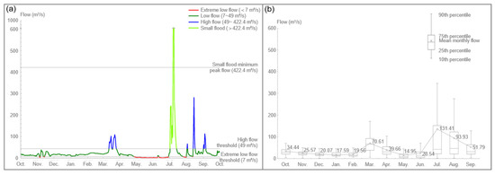 (a) the five environmental flow components identified by IHA for the Sanjiadian Station illustrated with the example year (1931 WY) hydrograph; (b) distribution of average monthly flows, Sanjiadian, Beijing (1920–1951).