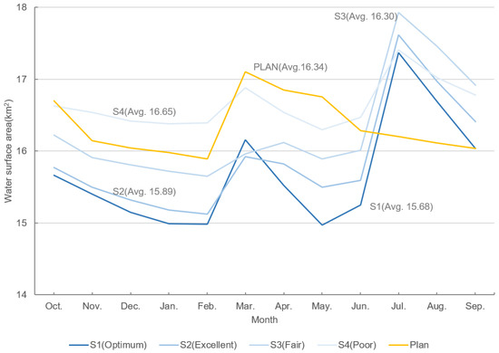 Monthly average water surface areas during the 10th year under the five scenarios.