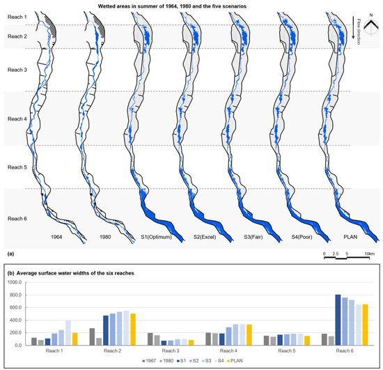 As previously mentioned, a significant widening of most reaches (except Reach 3) was evident in all five future scenarios (average summer surface water width 304.7–339.8 m) in comparison to historical conditions in 1964/1980 (189.3–149.5 m). In particular, the widening of reaches 2 and 6 was primarily due to mining and agricultural activities since the 1980s, whereas the narrowing of Reach 3 can be attributed to flow restriction by riparian tree planting during 2005–2008.
