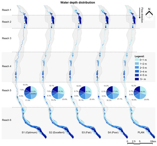 Calculated based on direct daily water depth outputs of C-L, the distribution of water depths in the 10th year showed that the 0–1 m class occurred the most frequently for all five scenarios (25.0–30.0%) (Table S4). The 1–2 m class most suitable for Carassius auratus also occurred often (20.4–23.6%). S4 showed the largest mean water depth (2.7 m), whereas PLAN showed the smallest (2.4 m). The maximum water depth (12.9–13.9 m) occurred in Reach 2 at the sandpit for all scenarios (Figure 8). The general decrease of maximum depth from S4 to S1 can be explained by higher flows exhibiting a stronger capacity to scour out a deeper channel at the southern end of the sandpit, leading to less water being stored in the sandpit.