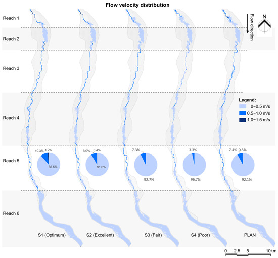 Based on daily flow velocity outputs within the 10th year, the highest average flow velocity across the study area occurred in July for S1–S4, as opposed to March during the longer 60 m3/s high-flow event for the PLAN scenario. Figure 9 and Table S5 showed the velocity distribution of the respective month when the highest average velocity occurred. The 0–0.5 m/s class happened the most frequently for all scenarios (88.5–96.7%), whereas the 1–1.5 m/s class happened the least frequently and only in S1, S2, and PLAN (0.4–1.2%). The maximum flow velocity of the scenarios ranged from 0.8 m/s (S4) to 1.3 m/s (PLAN), unlikely to affect the channel’s stability. High-velocity (>0.5 m/s) areas were mainly located within Reach 1 at the northern end and Reach 3 in the middle.