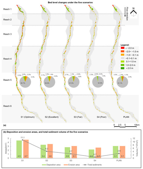 (a) Distribution of bed elevation changes under each scenario; (b) Deposition and erosion areas, and total sediment volume of the five scenarios.