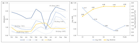 (a) Monthly average WUA of the five scenarios during the 10th year. (b) Average HHS and Average WUA/Vol. of the five scenarios.