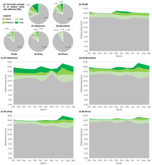 Second, regarding the distribution of habitat areas, the 12-month average % of wetted areas with high and medium CSIs decreased as the discharge decreased from S1 to S4, varying from 19.0% (S1) to 1.8% (S4) (Figure 12a). Again, PLAN nearly equaled to S3. The largest habitat areas with high/medium CSIs occurred in July for S1–S4 and April for PLAN (Figure 12b–f). S1 and S2 showed more even distributions of high/medium CSI areas than S3 and S4, which showed long gaps (4–8 months) with minimal high-CSI areas in particular.