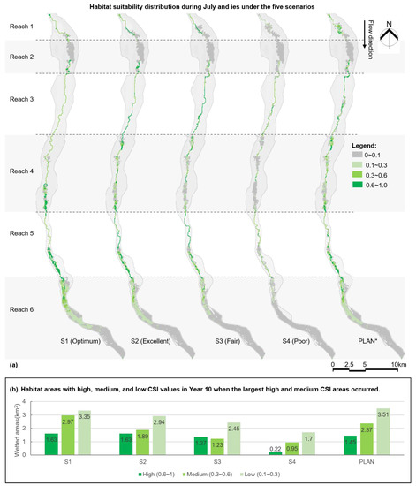 Third, to illustrate the habitat effects under high flows, we calculated and plotted the spatial distribution of CSI in Year 10 when the largest high/medium CSI areas occurred for each scenario, i.e., July for S1–S4 and on the last day of the 60 m3/s high-flow event for PLAN. The high- and medium-CSI areas ranged from 1.17 km2 (S4) to 4.60 km2 (S1). PLAN ranked second (3.82 km2) following S1 (Table S8). In all scenarios, Reaches 3 and 5 with a distinct channel structure showed consistently high CSI values (Figure 13). Other reaches showed variable CSI distributions under different scenarios. In particular, Reaches 1, 2, 4, and 6 showed minimum suitability under S4, and the sandpit in Reach 2 and agricultural fields at the southern end of Reach 6 showed consistently low suitability in all scenarios.