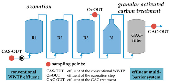Flow scheme of the advanced treatment demonstrator plant with sampling points (CAS: conventional activated sludge, R: ozone reactor, N: feed tank for GAC-filter, GAC: granular activated carbon).