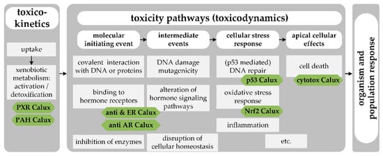 The in vitro bioassay test battery was designed to target MOA based on well-defined toxic mechanisms that cover relevant steps along the cellular toxicity pathway as recommended in the literature [10,13,14], see Figure 2. Even though positive signal responses cannot be directly translated into higher-order effects, every adverse outcome begins with a molecular initiating event. It demonstrates the link between biological response at the cellular level with higher-order effects on the organ, followed by the organism and eventually the population level, which is summarized under the concept of adverse outcome pathways [30].