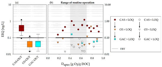 A median decrease of 92% was achieved for the ozonation process (n = 13, Figure 4), only for the two lowest Dspec < 0.3 g O3/g DOC the EEQ reduction was below 70%. Taking the smaller sample size for the GAC filter (n = 7) into account, the removal of the multibarrier system (O3 + GAC) was in the same range.