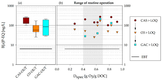 In the effluent of the conventional WWTP, the benzo[a]pyrene equivalents ranged between 100 and 270 ng/L, with a median at 145 ng/L. The ozonation resulted in a decrease of the B[a]P-EQ (Figure 6). Despite a median decline of 56–61% (cf. Figure 4), Figure 6 demonstrates the constant exceedance of the proposed and here applied EBT. This EBT is mainly based of B[a]P, while many kinds of different PAHs can occur in such complex mixtures.
