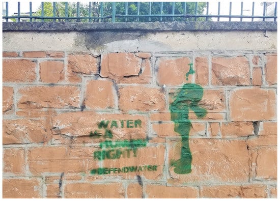 The Cape Town Day Zero crisis can probably be best described using the words of Nick Shepherd as a “slow catastrophe” [] (p. 1744) that was ultimately narrowly averted through drastic reductions in water consumption. Strikingly absent from reportage, analysis and commentary about Day Zero was any reference to the right to water [] (p. 1). Interestingly, this is despite Greenpeace Africa embarking on a national campaign at the time to highlight the right to water, which included spray-painting stencils across South Africa’s Cities with the slogan “water is a human right, defend water” alongside the picture of a young girl trying to drink from a water tap—see Figure 1 below [].