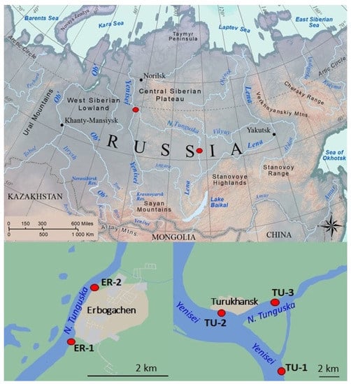 Sampling sites were located in the middle course of the N. Tunguska near Erbogachen (ER-1-ER-2), and in the mouth of the Nizhnyaya Tunguska River near Turukhansk (TU-1–TU-3) (Figure 1 and Figure S1, Table 1). Sampling of surface water and bottom sediments was conducted from the right bank in late June–mid July 2021.