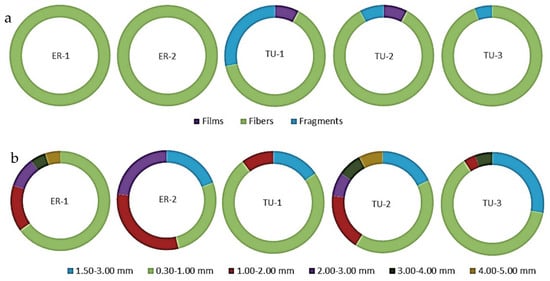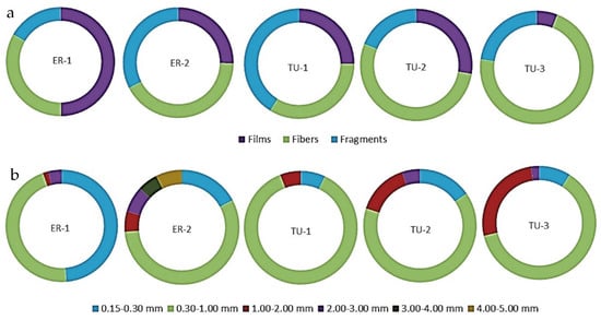 The sizes of MPs particles from riverine water and bottom sediments were analyzed visually using a stereomicroscope (Figure 2b and Figure 3b). Since visual analysis has limitations on the size of the detected particles [], only MPs larger than 0.15 were counted. In most of the studied water and bottom sediment samples, particles from 0.30 to 1.00 mm were most abundant (Figure 2b and Figure 3b). Particles of more than 3.00 mm in the longest axis were found in one of the water samples (ER-2) and in several sediment samples (ER-1, TU-2, TU-3).