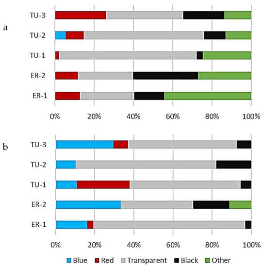 Mostly transparent MPs were found in the water (up to 70% in TU-1) and in bottom sediments (up to 77% in ER-1), Figure 4. In the surface water, we found also red, black and other colored particles, blue particles were detected in TU-2 only (Figure 4a). MPs color distribution profiles differed for bottom sediments where blue particles were the second major group followed by black MPs (Figure 4b).