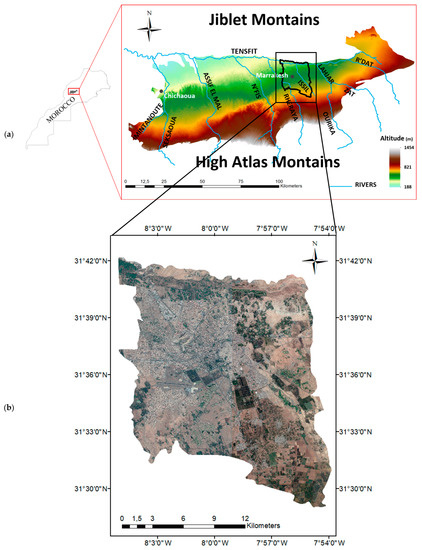 For over half a century, the city of Marrakesh and its region has had a great economic, demographic and urban development, marked by an exceptional construction boom [1,2]. The buildable surface area increased from 2000 ha in the beginning of the 1970s to almost 20,000 ha in 2020 [3,4]. This process has enormously upsurged during the last 20 years since the city has become the Moroccan tourism capital, receiving 3 million visitors annually [5,6]. The region is also the main mining region in the country (28% of the national production) and one of the main agricultural areas [7,8]. This situation places increasing pressure on natural resources, particularly groundwater resources used for agricultural irrigation, drinking water supplies and other activities [9].