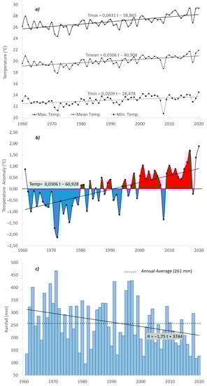 Annual average and extreme (averaged maximum and minimum temperatures) temperature values (a), temperature anomalies (b) and annual rainfall (c) for the period 1960–2020 in Marakech-Marrakesh (31°37′12″ N; 8°1′48″ W).