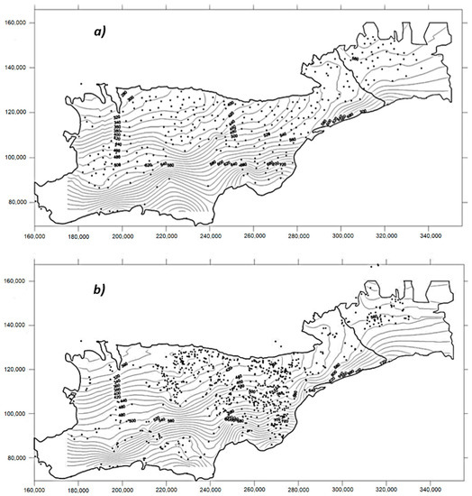 Original maps of groundwater level in the Haouz Plain for the years (a) 1986 and (b) 2002. Points indicate observation wells-ABHT.