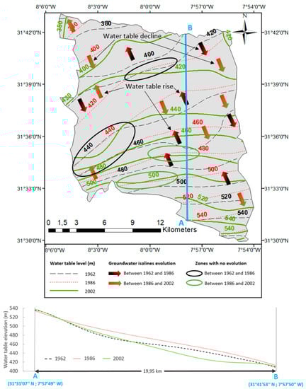 As shown in Figure 5, the majority of black–red arrows point to the south, while the opposite is seen for the red–green arrows. This indicates that the water table increased from 1962 up to 1986, before starting a decline between 1986 and 2002. The groundwater level remained stable both in the southwest of the study area from 1962 to 1986, and in a large part of the zone stretching from east to west between 31°33′ and 31°36′ for the period 1986–2002.