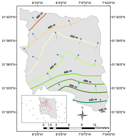 The groundwater flows generally from the south toward the northern part of the region (Tensift River), with a strong downward hydraulic gradient near the southern edge of the aquifer.