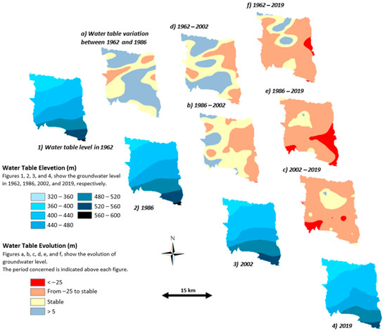 Finally, over the whole period under consideration, i.e., from 1962 to 2019 (Figure 8f), the water table dropped in a large part of the territory (71% of its extension), with a zone in the east, representing 3% of the whole area, in which the decline exceeds 25 m. The groundwater remained stable in 18% and increased in 8% of the area. These latter zones are located in the north-central part of the map.