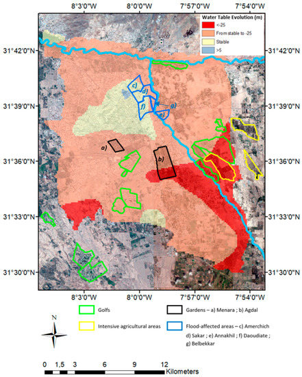 Despite the aquifer recharge from surface water provided by the Issil River and the infiltration of irrigation water, there is a general decline in the water table, particularly in the period after 1986. This reflects a regional phenomenon in the Haouz Plain, where the quantity of groundwater has continued to fall during the last decades, mostly due to some human exploitation that results in consuming large amounts of groundwater, such as intensive agricultural uses and some leisure practices, such as golf courses, waterparks and pools.