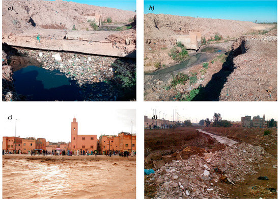 As described in Section 2.1, the rapid accumulation of water in the river outlet with a risk of a sudden upwelling at the entrance of the city, and into the urban area all along the river, is a phenomenon that is recurring regularly, leading to floods in many areas in Marrakesh [35]. Over the last 10 years, the neighbourhoods most impacted have been Sakar, the Wilaya, Belbekkar, Daoudiate, Nakhil and Amerchich (Figure 9).