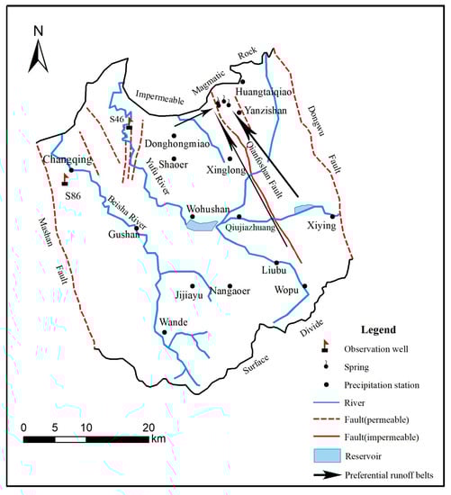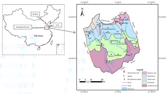 More than 25% of the world’s population either lives on or obtains water from karst aquifers, which makes the understanding of these systems crucial to water management [1]. The Jinan karst system is one of the typical karst systems in North China, and karst aquifers contain much of the groundwater resource, which is an important water source. The Cambrian and Ordovician carbonate rocks, which are easily dissolvable, are widely distributed in Jinan. Affected by geological structure, lithology, climate and other factors, a large number of karst fractures and pipelines have been developed, which have become a good channel for groundwater migration and a huge storage space. Jinan City has been known as “Spring City” since ancient times because of its fractured-karst springs. Spring is a concentrated discharge of groundwater appearing at the ground surface as a current of flowing water. However, in recent years, due to social and economic development in Jinan, urbanization has significantly accelerated the extraction of karst groundwater. Despite the fact that protective measures such as limited exploitation and artificial recharge of groundwater have been adopted in Jinan, the spring is still at risk of drying up. This is mainly because of insufficient understanding about the spring recharge [2,3,4]. It is extremely important to carry out karst water protection scientifically and effectively in the Jinan Spring Basin. Artificial recharge has a dependable repair effect on Jinan karst water systems [5,6]. Jinan springs are mainly affected by natural factors and human factors. Natural factors include atmospheric precipitation, and human factors include groundwater exploitation and urbanization [3,7]. The primary factor that has affected spring dynamics since 2003 is atmospheric precipitation [5]. Precipitation infiltration is a major recharge source of karst groundwater in karst region, and the variation of groundwater level and spring discharge in Jinan is closely related to precipitation [8]. Using remote sensing technology and groundwater numerical simulation, it was found that rapid urbanization has reduced precipitation infiltration recharge in the Jinan Spring Basin [9]. The time-lag of spring water level and precipitation in Jinan on a yearly scale for 1959–2011 is around 3–4 months based on wavelet transform [10]. Precipitation and spring discharge data are considered the input and output signals of a karst spring catchment, respectively [11]. Karst aquifers have very high spatial heterogeneity, the distributions of pores, fractures, and conduits in karst aquifers are extremely uneven, and this heterogeneity strongly influences the hydraulic behavior of the karst. From the south of the Jinan Spring Basin to the spring discharge area, the karst development varies from weak to strong, forming a complex underground network system of dissolution fissures–caves–pipes. The higher the degree of karst development, the better the permeability. The karst near the spring is the most developed, where dissolution conduits and fractures form a strong karst development zone. According to the analysis of existing borehole data in the Jinan Spring Basin, the hydraulic conductivity is 10–100 m/d in most areas, and may be greater than 100 m/d in the area near the spring.