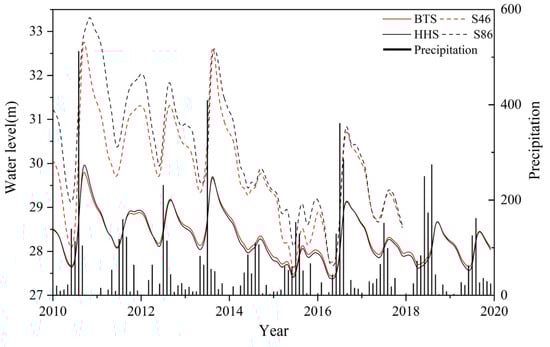 The Pearson correlation coefficient of monthly precipitation and spring water levels of BTS and HHS was calculated and ranked (Table 3), the correlation coefficients are small, but a high correlation might not always mean that there is a good relationship between the variables and a correlation close to zero might not mean that there is no relationship between the variables. This approach, without considering the variation of behavior seen through time series data, might cause misleading results [32,38].