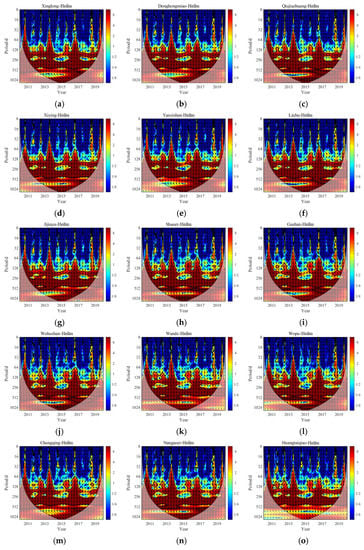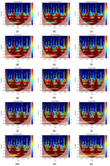 The XWTs of precipitation and BTS water level. (a–o) fifteen precipitation stations. The color scale indicates the cross wavelet power spectrum density corresponding to the different colors. The red and blue on the color scale represent the peak and valley values of power spectrum density, respectively. The thick black contour designates the 5% significance level against red noise, lighter shade represents the COI, and the arrows represents relative phase relationship of two time-series. The relative phase relationship of the two time-series is shown as arrows (with in-phase pointing right, anti-phase pointing left [13].)
