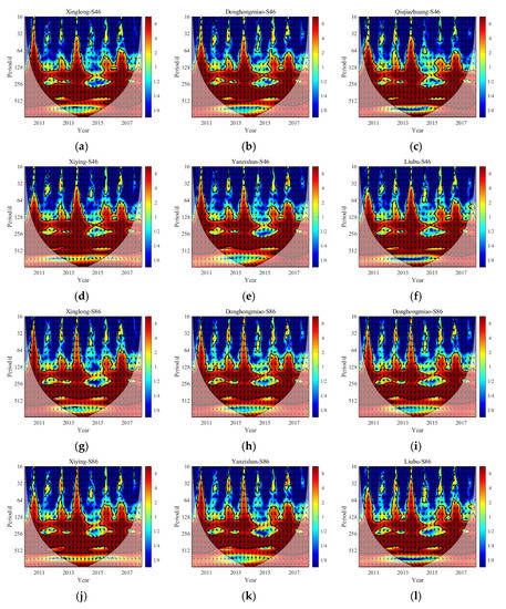 The XWTs of precipitation and groundwater level. (a–f) six precipitation stations and S46; (g–l) six precipitation stations and S86.