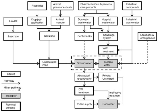 Sources and potential routes of EPs in the water environment [25]. (Reproduced from [25] with Elsevier permission, license 5191080813331, from 16 November 2021).