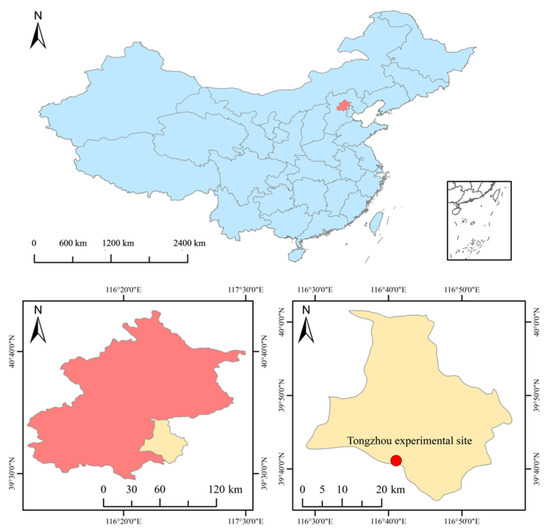 The experiment site of Tongzhou, Beijing, China, is shown in Figure 1. The details of trail conditions and agricultural management are described in Chi et al. [20]. The experiment set two types of water quality (reclaimed water and underground water) and two types of fertilizer (urea and slow released fertilizer), as shown in Table 1. The properties of the soil in all treatments were measured at the beginning of the experiment. The sampling took place in October 2013 and the details are shown in Table 2.