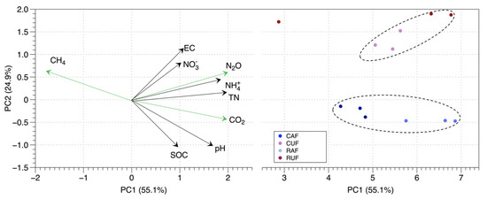 The PC1 was 55.1% and the PC2 was 24.9%. As shown in Figure 2, UF treatments in PC2 were higher than AF treatments, and RW (reclaimed water) treatments in PC1 were higher than CW (clean/underground water) treatments. Type of fertilizer respect PC2, type of water respect PC1. EC, NO3−, N2O and NH4+ occurred on the first quadrant. pH, SOC and CO2 occurred on the fourth quadrant. CH4 was at the second quadrant. The N2O emission flux was related to EC, NO3−, NH4+ and TN, the CO2 emission flux was related to SOC, pH and TN, but these soil properties had no relationship with soil CH4 emission. Moreover, all treatments were divided into two parts according to fertilizer type (Figure 2). During the four-year experiment, reclaimed water could effectively soil pH, TN, NO3−, and the greenhouse gas (CO2, N2O and CH4) was related to the type quality of irrigated water. The absolute value of NH4+, EC and SOC in PC2 was higher than PC1.