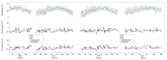 The patterns of temperature and soil CH4 emission flux from 2013 to 2016.