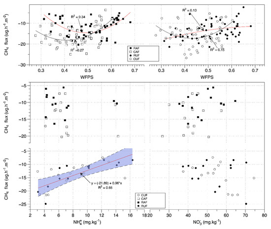 In order to analyze the factors that could impact methane emission, the paper shows the relationship between methane and WFPS, soil nitrogen. As shown in Figure 4, the relationship between WFPS and methane was quadratic, and the R2 in AF treatment was higher UF. Meanwhile, the RAF (0.15) and RUF (0.34) was higher CUF (0.13) and CAF (0.26). As shown in Figure 4, there was a strong linear relationship between methane and soil NH4+, the R2 in RUF and CUF was 0.65 and 0.32, respectively (Table 4). However, there is no relationship between methane and soil NO3−.