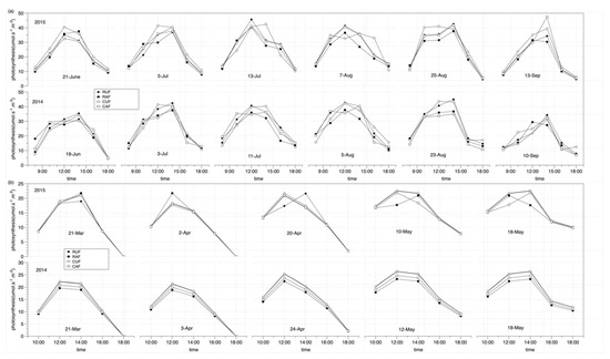 As shown in Figure 5, photosynthesis from 2014 to 2015 had similar varieties among all treatments; photosynthesis first increased and then decreased. There is a strong correlation between photosynthesis and temperature, the highest value appeared between 12:00 and 15:00, and the average value in the summer-maize period was higher than in the winter-wheat period. The highest value appeared in August during the summer-maize period, white-wheat kept it steady among all treatments. As shown in Table 5, there was no significant difference (p > 0.05) between RW and CW, and photosynthesis in UF was higher than AF during the whole period.