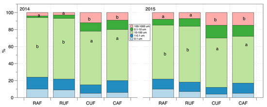 The distribution of particle size among all treatment in 2014 and 2015. Means followed by the same letter within a particle size range are not significantly different according to t-test (p < 0.05).