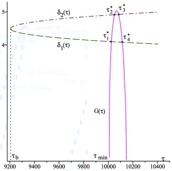 We have in this case , so that holds true. Denote . Then the characteristic Equation (20) takes the form