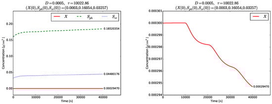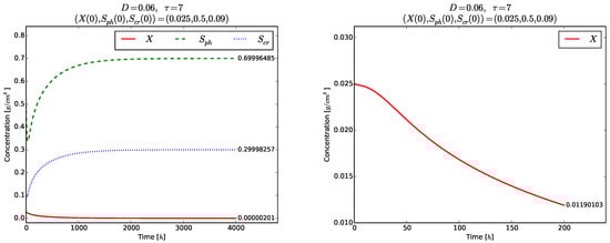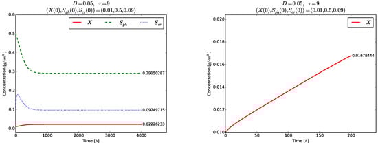 has to be satisfied so that the model (3)–(5) possesses positive solutions. The left plot in Figure 8 illustrates the global stability of the washout equilibrium . The right plot of Figure 8 and Figure 9 show the evolution of each phase variable , , for a shorter time . Again, no transient oscillations can be seen in these plots.