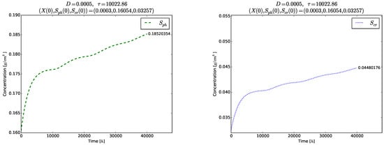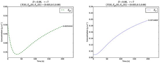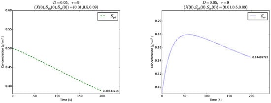 Finally, in Section 3, we established the existence and uniqueness of positive model solutions in Theorem 4. We reduced the 3-dimensional model (3)–(5) into a limiting 2-dimensional dynamical system (41). Although the reduced model was very similar to well known bioreactor models, the main difference was in the specific properties of the SKIP function and, in particular, of . We proved in Theorem 5 the global asymptotic stability of the coexistence equilibrium point with respect to whenever it exists, i.e., for . However, if , then the washout equilibrium is globally asymptotically stable (Theorem 6). These results mean practically either long-term sustainability of the biodegradation process when is the global attractor or process breakdown due to total washout of the biomass in the reactor when is the global attractor. Numerical examples in Section 4 (Examples 2 and 3) confirmed the latter theoretical results.