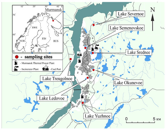 The article presents the results of the field studies of Murmansk in 2019–2020. The research covered seven lakes in the city of Murmansk (Semenovskoe, Ledovoe, Severnoe, Okunevoe, Srednee, Yuzhnoe, Treugolnoe) subject to various levels of anthropogenic load from the main sources of pollution (heating plants, the coal terminal, the waste incineration plant, etc.). It is noteworthy that three selected lakes are not officially named and two of them were named according to their geographical location: (Severnoe (Northern) and Yuzhnoe (Southern)), Lake Treugolnoe (Triangular) was named by the authors because of its shape (Figure 1).