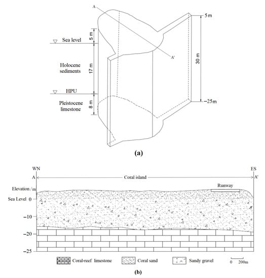 The coral island is elliptical above sea level, with a length of 1.928 km from east to west, a width of 1.380 km from south to north and an area of 2.1 km2. The island sits on a late Precambrian granite gneiss substrate. To ensure the integrity of the model, the maximum depth of the model was taken to 25 m below the surface and the island elevation above sea level was set at 5 m. Approximately 17 m below sea level is the junction of the two strata, which is called “Thurber discontinuity” or “Holocene–Pleistocene unconformity” (HPU) []. The top layer (0–5 m) consists of plain fill and coral medium sand; above HPU is the Holocene coral shell sedimentary layer, which is mainly formed by the accumulation of coral shell debris, other biological skeletons and gravel; the layer below HPU is composed of Pleistocene limestone with well-developed karstification. As there is virtually no surface runoff from the study island, the major recharge source of groundwater is atmospheric precipitation infiltration. Based on the above hydrogeological conditions, the generalized model of the island’s hydrogeology is shown in Figure 1.