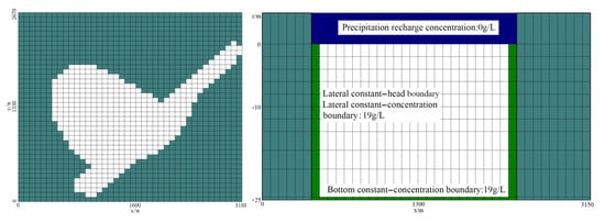 where is the hydraulic conductivity (m/d), is the piezometric head (m), C is solute concentration (g·L−1), is the water storage rate (m−1), t is time (d), n is the medium’s porosity; is the density coupling coefficient (kg·m−3), is the mixed fluid density (kg·m−3), is the freshwater density (kg·m−3) and is the volume of source and sink items entering unit volume aquifer in unit time (d−1).