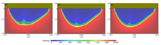 Sectional views of freshwater lenses in 10 years (a), 30 years (b) and 50 years (c).