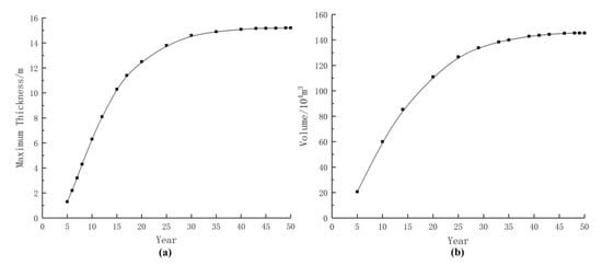 Figure 4 shows the curves of the maximum thickness (a) and volume (b) of the freshwater lens as a function of time. Both curves follow the same trend, with the growth rate increasing rapidly at the beginning of the formation of the freshwater lens, slowing down after about 10 years and reaching stability at about 45 years, with the maximum thickness and volume of the freshwater lens getting close to 15.2 m and 145.4 × 104 m³, respectively. The simulation results of the basic model are similar to those of Zhou and Fang [].